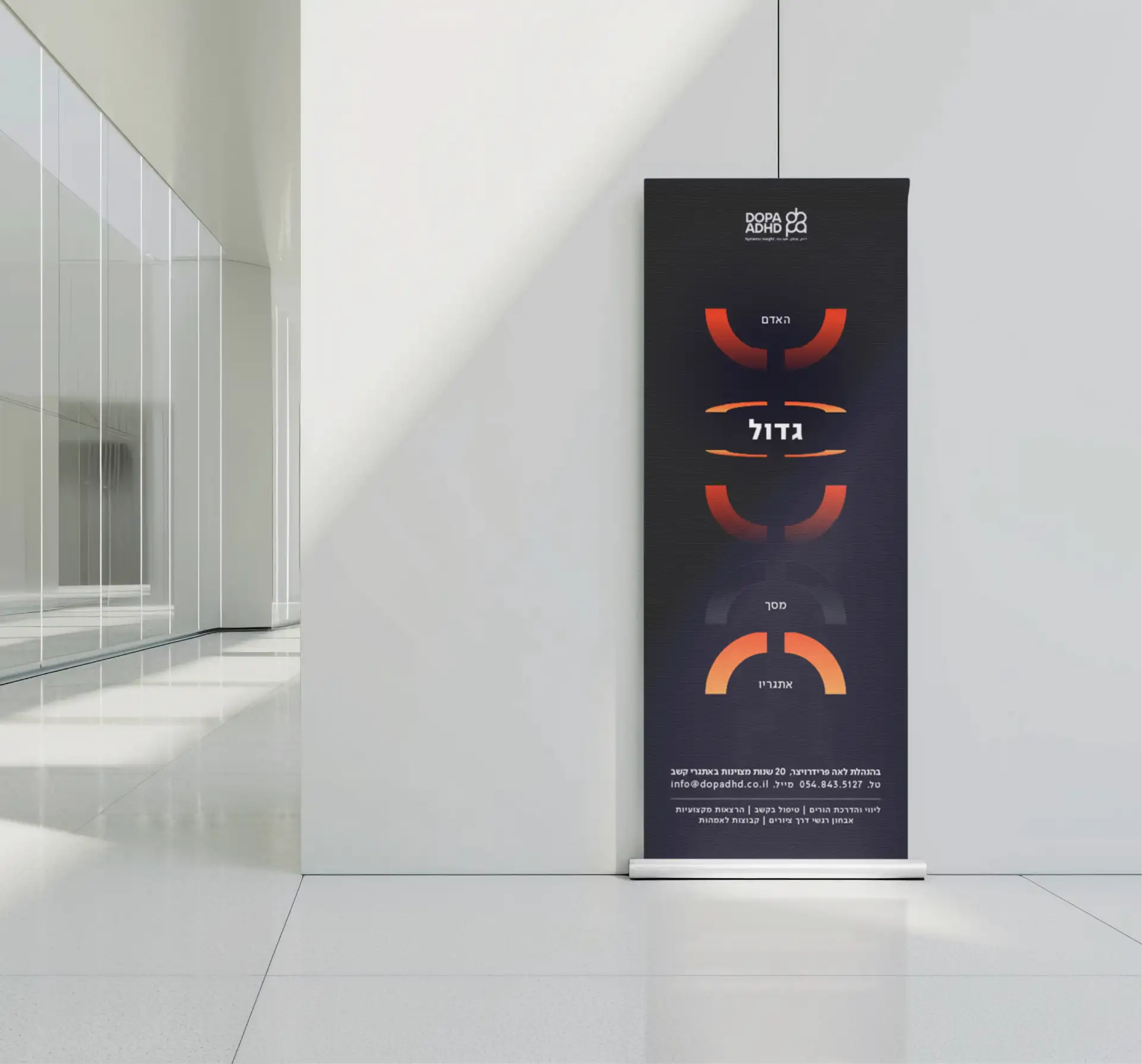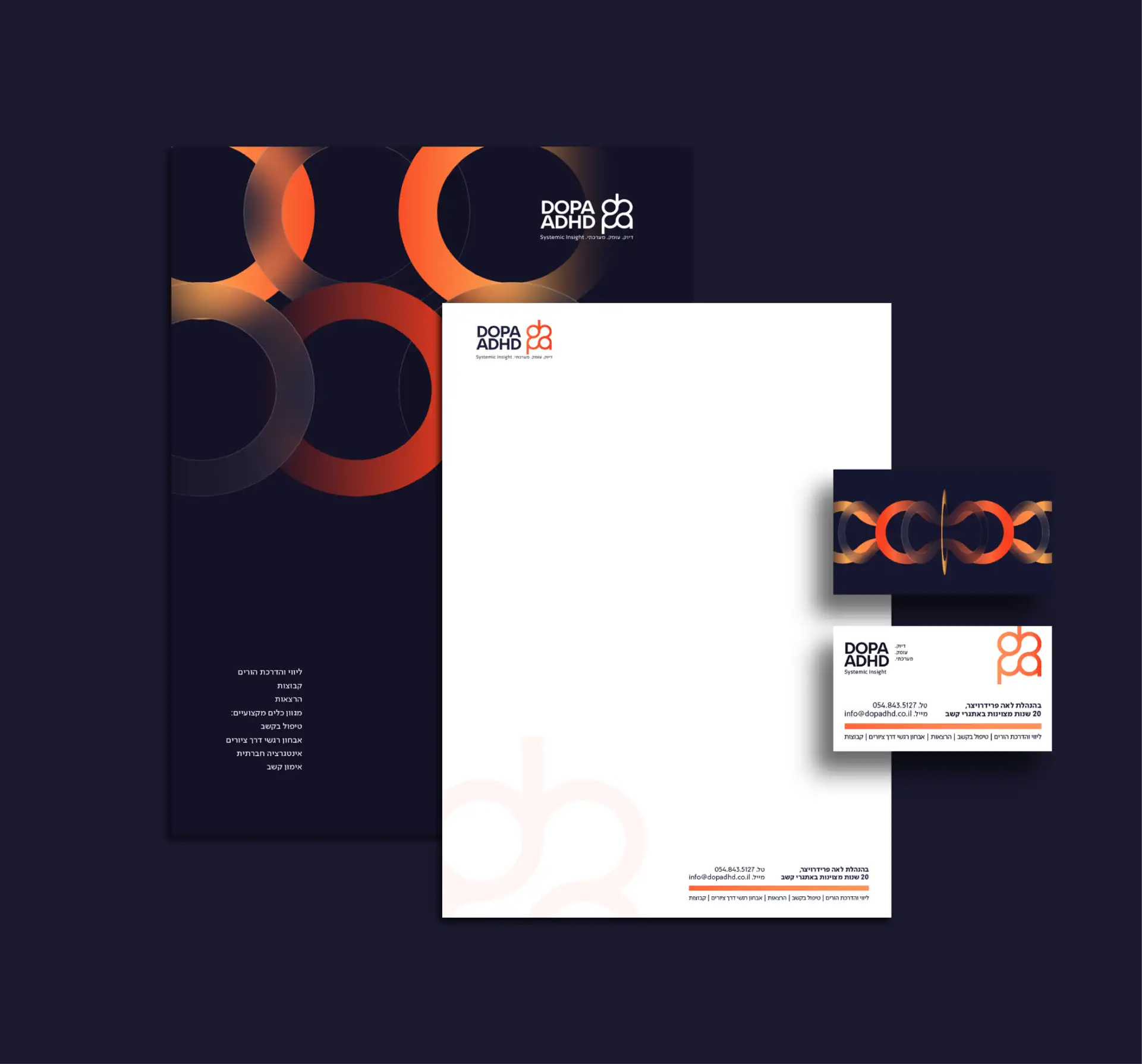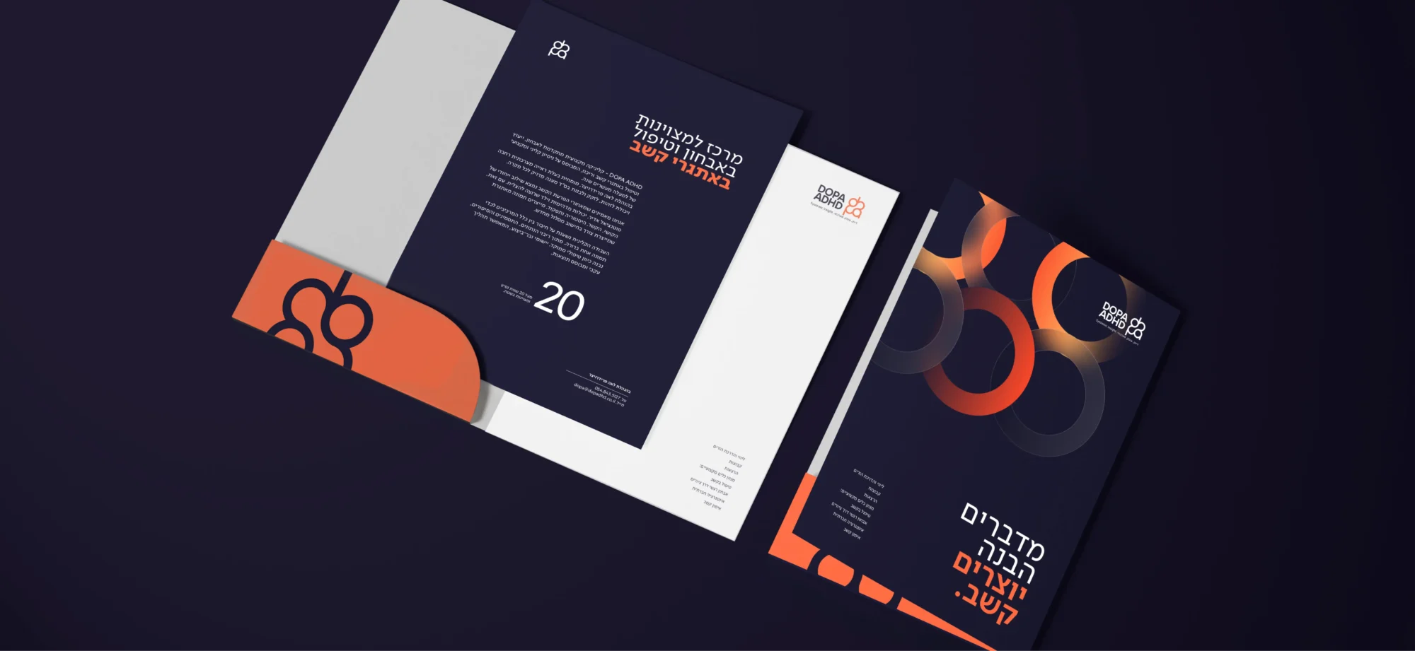 את הקונספט תרגמתי לשפה גרפית נקייה ומשמעותית: הלוגו: מחבר באופן אורגני בין אותיות שם המרכז לבין עולם התוכן של קשב וריכוז. המבנה שואב השראה מהמרקם המורכב של המוח האנושי, תוך שימוש בקווים מתפתלים ועיגולים נקיים המתלכדים לכדי אלמנט ויזואלי אחד ומגובש. השפה הגרפית: השפה פותחה כרשת של חיבורים. צורות מעוגלות נפגשות ומתמזגות ליצירת קומפוזיציה הרמונית, הממחישה את הקשר ומורכבות החלקים לתוצר מקיף ושלם.