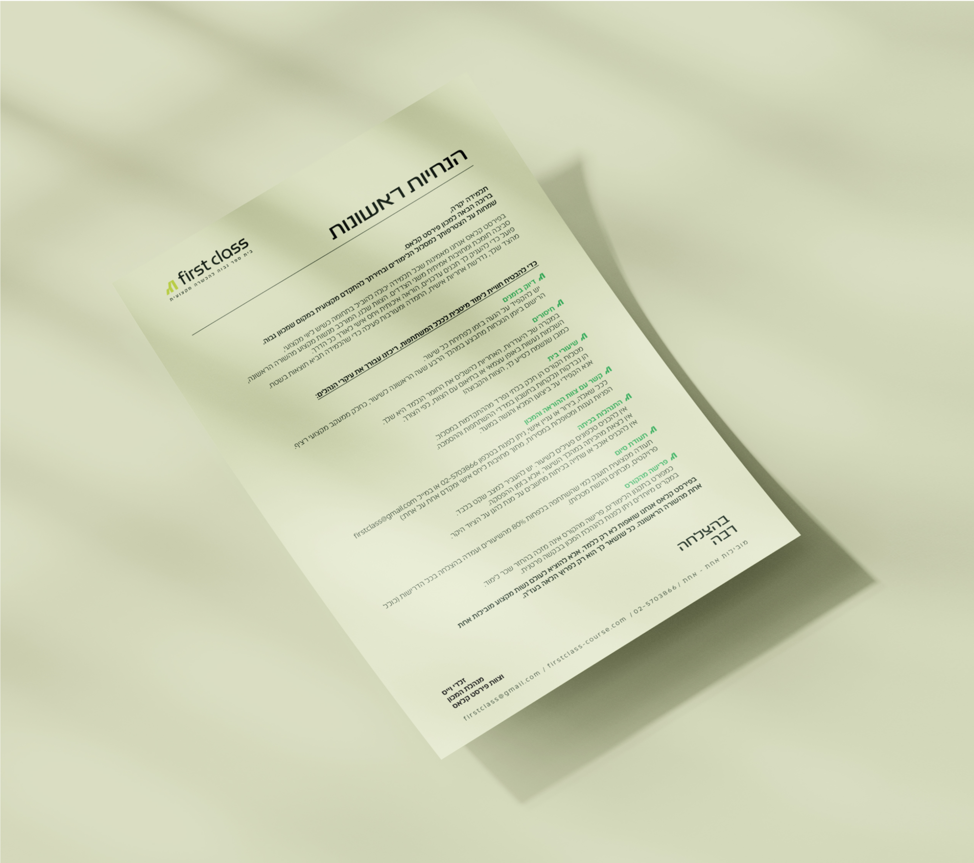 פירסט קלאס מייצג בית ספר גבוה ללימודי מקצוע, מוביל ומוקפד שמכוון להישגים ולמצוינות, לצד בית חם המאמין שכל בת היא עולם שלם וייחודי. מתוך הבסיס הזה, תחת פרסום מרקר בניהולה של מירי רודרמן, נוצר הקונספט 1:1, המדגיש את יכולות המכון, לצד הצבת כל תלמידה כערך מרכזי, כל אחת במקום הראשון.
