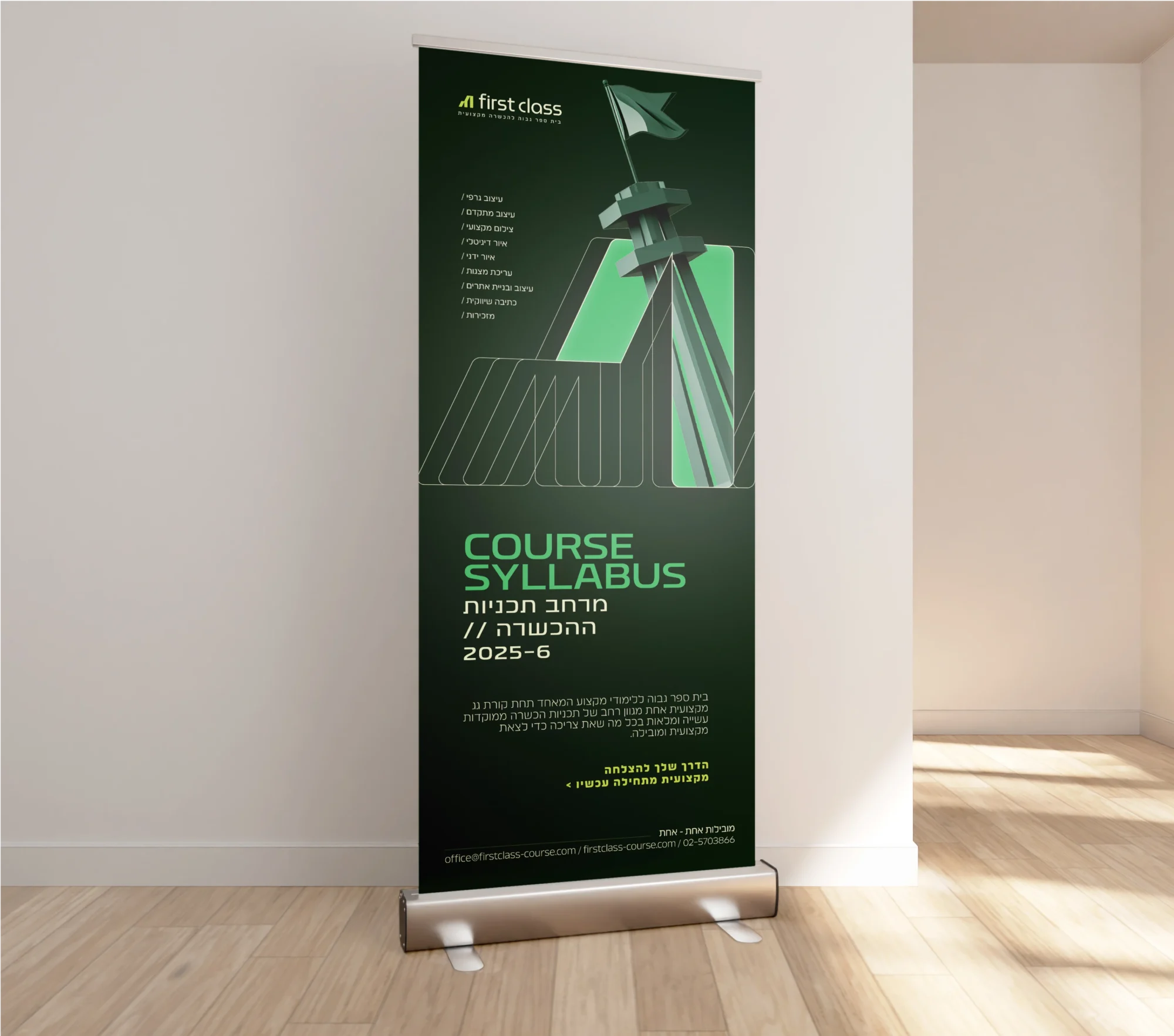 על פי הקונספט פיתחתי את השפה העיצובית: הלוגו, הפטרנים, הגריד והקו הגרפי נבנו סביב רעיון של צמיחה והובלה אישית. המשחק עם הספרה 1, הקווים הכפולים והמגדלים הגבוהים, מייצרים אמירה חזותית ברורה של אקדמאיות, מקצועיות והובלה חד משמעית.